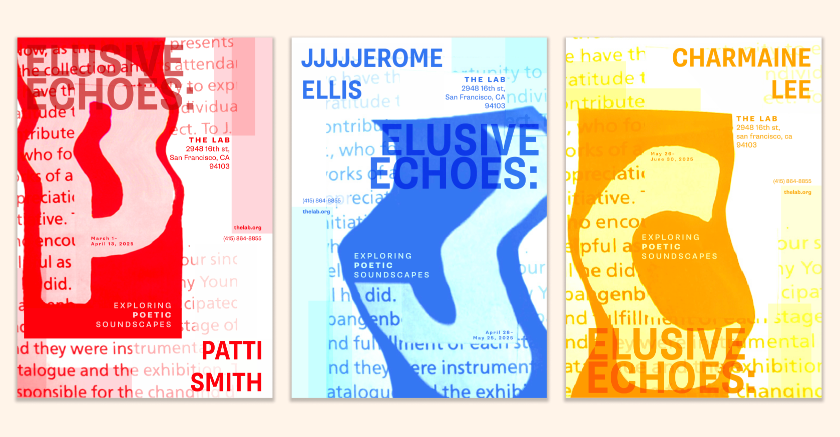 Create a series of 3 Posters to showcase 3 music artists/poets performing in a show called Elusive Echoes. The posters should feel connected but also be visually distinct. Each poster should represent the poets and catch the attention of music lovers who would be attending the show.